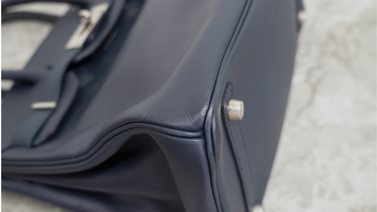 今回ご依頼いただいたのは、エルメスの代表的な人気モデル「バーキン(クシュベル/ネイビー)」です。クシュベルは、細やかな型押しと程よいハリ感を持つカーフレザーで、光沢と上品な発色が魅力の高級素材です。しっかりとした質感で型崩れしにくい反面、角スレや表面の退色、色ムラが目立ちやすい特性もあります。
