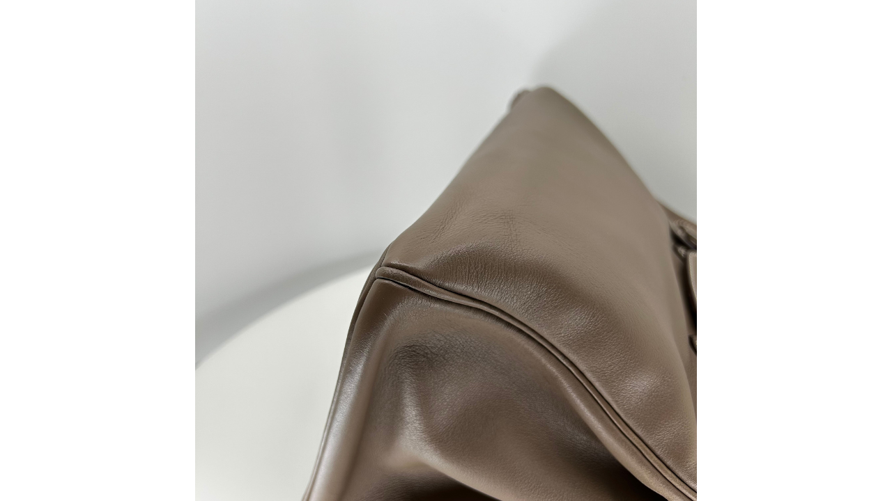今回ご依頼いただいたのは、エルメスの代表的なハンドバッグ「バーキン35(スイフト/エトープ)」です。しなやかで滑らかな手触りが特徴のスイフトレザーは、美しい発色と柔らかさで多くのファンを魅了する一方、キズや黒ずみ・スレが目立ちやすいという繊細な一面もあります。エトープ(グレージュ系)の落ち着いたカラーはどんなコーディネートにも馴染みやすく、特に人気の高い色味ですが、淡色ならではの悩みとして、経年によるくすみや角のスレ、ハンドル周辺の手垢汚れなどが顕著になってきます。今回のお客様も、「お気に入りのバーキンだから、これからも長く大切に使っていきたい。黒ずみや色ムラを自然に整えて、品のある状態を取り戻したい」とのご希望から、当店へご相談くださいました。革の質感とエルメスらしい品格を損なうことなく、補色・クリーニング・黒ずみ除去などの修理を丁寧に実施させていただきました。